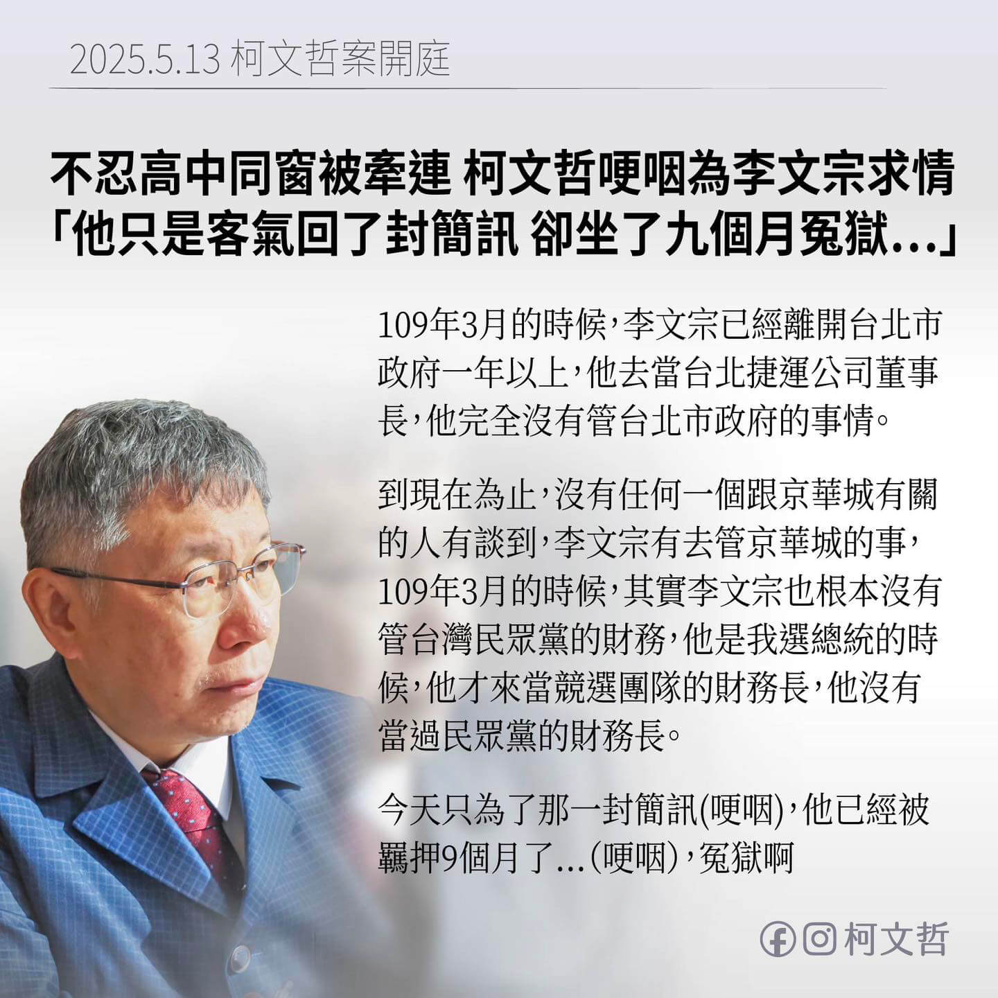 李文宗氏の弁護に立った際、彼の感情は最高潮に達した。李氏は台湾民衆党の財務責任者を務めたことはなく、京華城事件にも一切関与していないと断言した。李氏は朱亜虎氏からの寄付に関する祝賀メッセージに丁重に応答しただけであり、その後、虚偽の申し立てに基づき検察官によって告発され、約9ヶ月間拘留されていると述べた。感情を露わにした柯氏は、事態の不正義さを強調し、李氏の保釈を裁判官に嘆願した。