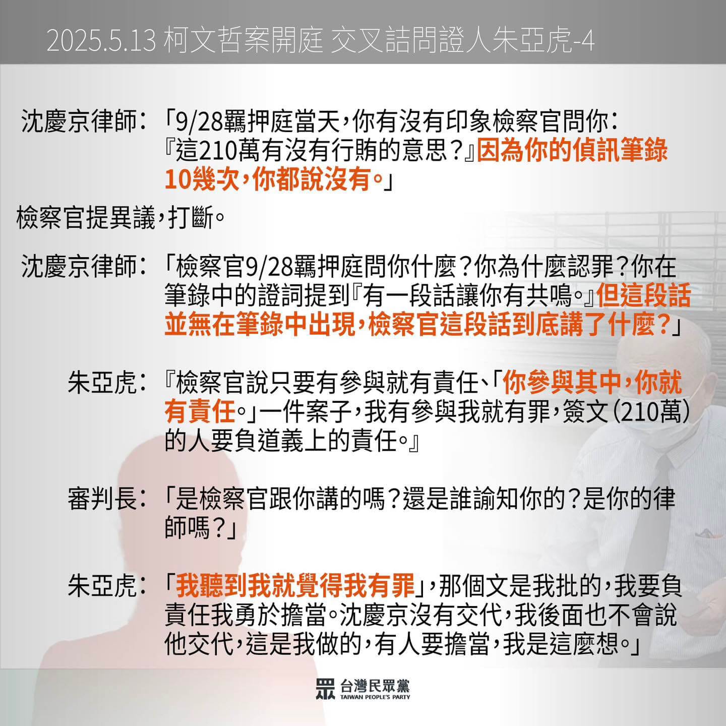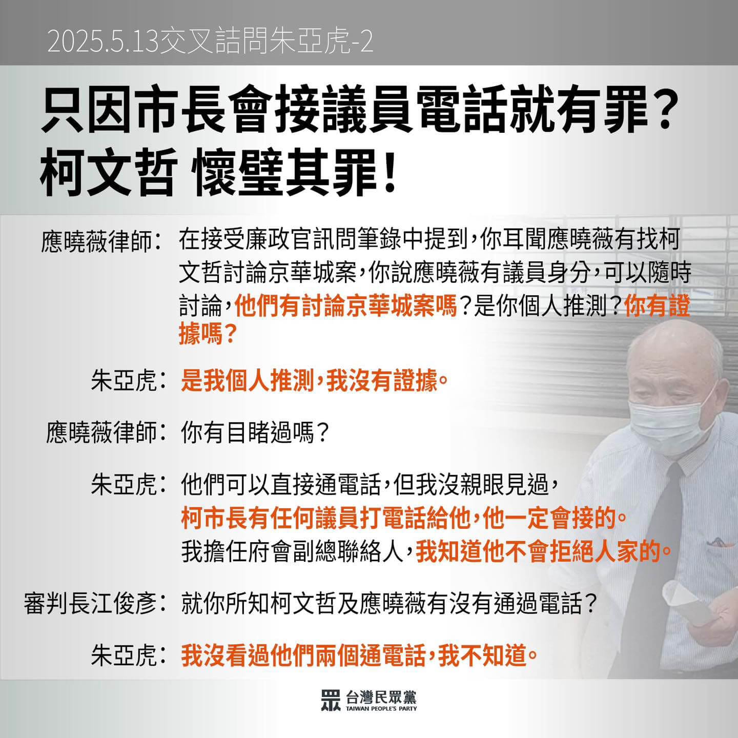 先週、沈慶京氏と柯文哲氏の間の会話に関する彼の陳述が憶測であったことを認めた後、朱亜虎氏は本日さらに、柯氏と應曉薇氏が京華城事件について話し合ったという彼の主張が純粋な想像であったことを自白した。