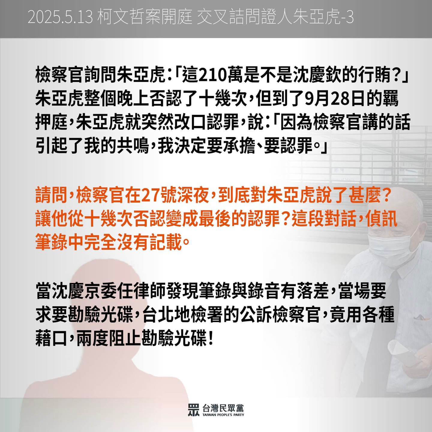 本日の反対尋問では、憂慮すべき問題が明らかになった。9月27日の深夜の尋問中、検察官は朱亜虎氏に210万台湾ドルの支払いについて繰り返し質問し、それが沈慶京氏からの賄賂であることを示唆した。