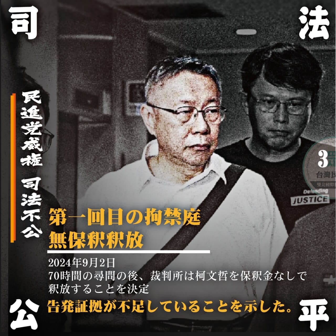 8月30日の朝7時から、柯 文哲は率先してICACの捜査に協力し、8月31日に違法な夜間尋問のために台北地方検察庁に移され、柯 文哲夜間尋問を止めて自宅に戻って休むように求めましたが、検察は捜査を拒否したという理由で柯 文哲を拘束し、夜間尋問の問題を隠蔽しました。これは、台湾の司法が再び暗闇に戻った最初の日でした。