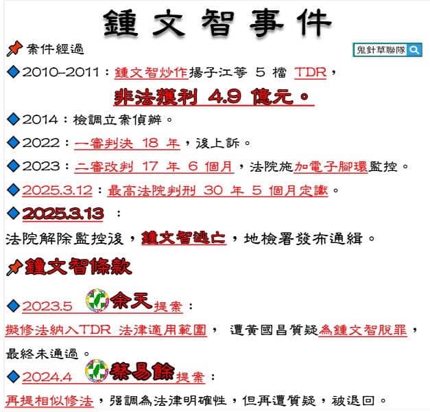 Chung Wen-chih was suspected of multiple financial crimes, notably speculating in Taiwan Depositary Receipts (TDRs), which harmed many investors. He once jumped bail and fled during the investigation, but was later recaptured. After the final verdict was issued, he absconded once again.